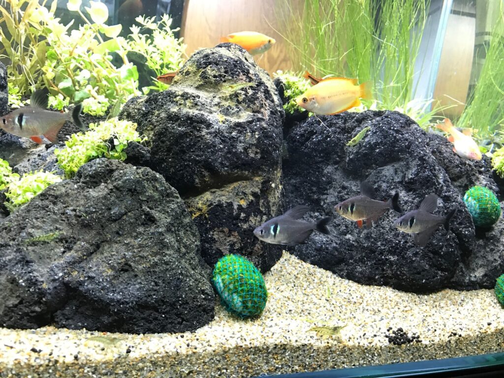 その中に黒を入れることで、それがアクセントになって互いに引き立てあうので、より見てて楽しい水槽ができます。